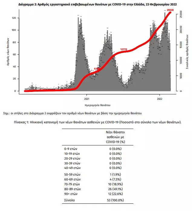Οι νέοι θάνατοι ασθενών με COVID-19 είναι 53, ενώ από την έναρξη της επιδημίας έχουν καταγραφεί συνολικά 25.538 θάνατοι. Το 95.0% είχε υποκείμενο νόσημα ή/και ηλικία 70 ετών και άνω.