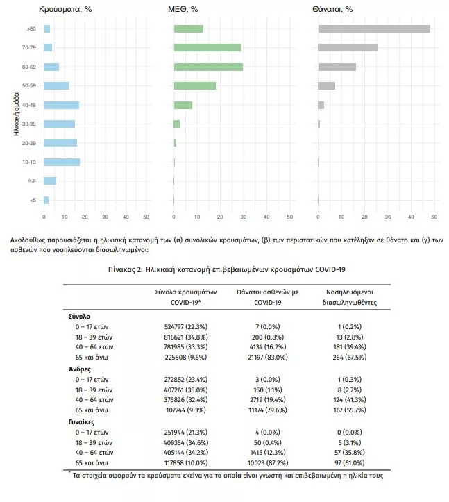 Ο αριθμός των ασθενών που νοσηλεύονται διασωληνωμένοι είναι 459 (65.4% άνδρες). Η διάμεση ηλικία τους είναι 67 έτη. To 88.2% έχει υποκείμενο νόσημα ή/και ηλικία 70 ετών και άνω. Μεταξύ των ασθενών που νοσηλεύονται διασωληνωμένοι, 333 (72.55%) είναι ανεμβολίαστοι ή μερικώς εμβολιασμένοι και 126 (27.45%) είναι πλήρως εμβολιασμένοι. Από την αρχή της πανδημίας έχουν εξέλθει από τις ΜΕΘ 4.232 ασθενείς. Οι εισαγωγές νέων ασθενών Covid-19 στα νοσοκομεία της επικράτειας είναι 372 (ημερήσια μεταβολή +2.48%). Ο μέσος όρος εισαγωγών του επταημέρου είναι 353 ασθενείς.Η διάμεση ηλικία των κρουσμάτων είναι 35 έτη (εύρος 0.2 έως 106 έτη), ενώ η διάμεση ηλικία των θανόντων είναι 79 έτη (εύρος 0.2 έως 106 έτη).
