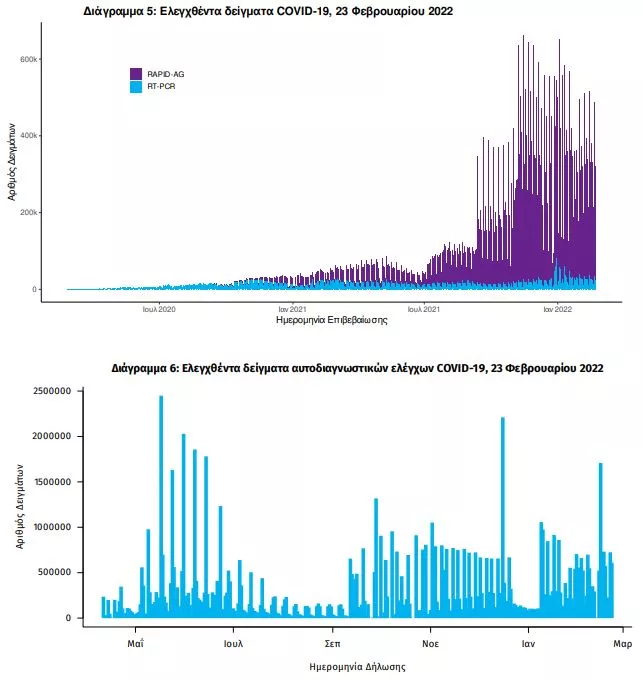 Δείγματα που έχουν ελεγχθεί: Από την 1η Ιανουαρίου 2020 μέχρι σήμερα, στα εργαστήρια που διενεργούν ελέγχους για τον νέο κορωνοϊό (SARS-CoV-2) και που δηλώνουν συστηματικά το σύνολο των δειγμάτων που ελέγχουν, έχουν συνολικά ελεγχθεί 9.824.383 κλινικά δείγματα ενώ από Μονάδες Υγείας και Κλιμάκια του ΕΟΔΥ που διενεργούν ελέγχους Rapid Ag έχουν ελεγχθεί 54.455.875 δείγματα. O μέσος όρος του επταημέρου είναι 309.492 δειγματοληπτικοί έλεγχοι.