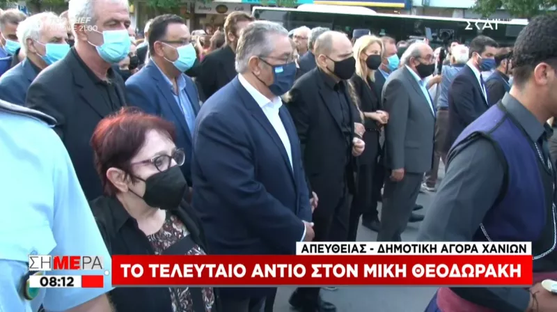 Κρατώντας ένα λουλούδι στο χέρι και εμφανώς συγκινημένοι εκατοντάδες πολίτες συρρέουν από το πρωί στον μητροπολιτικό ναό των Εισοδίων της Θεοτόκου στα Χανιά, για να αποτίσουν φόρο τιμής στον Μίκη Θεοδωράκη. Μεταξύ αυτών και πολλοί ξένοι τουρίστες που με τα κινητά τους τηλέφωνα καταγράφουν εικόνες από το σημείο.
