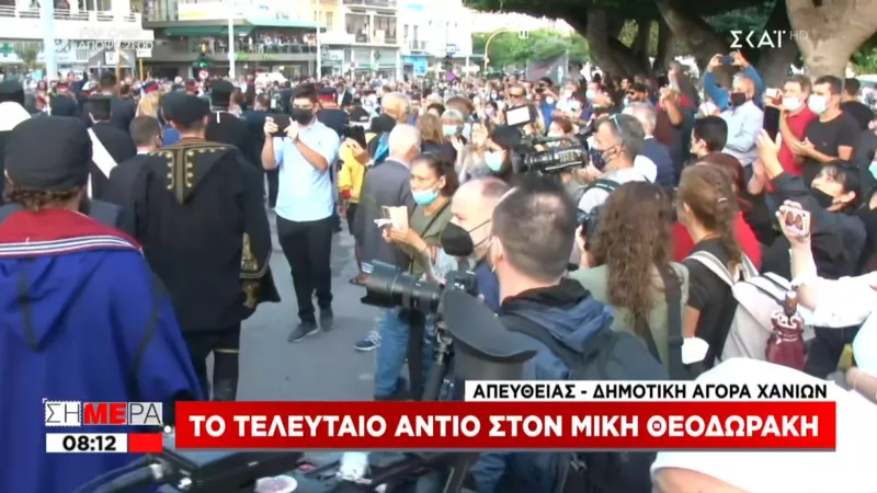 Υπό τους ήχους της Φιλαρμονικής του δήμου Χανίων που παιάνιζαν συνθέσεις του Μίκη Θεοδωράκη, πλήθος κόσμου βρέθηκε από νωρίς στη Δημοτική Αγορά για να πει το τελευταίο αντίο τον άνθρωπο που έκανε μέσω του έργου του γνωστή την Ελλάδα σε όλο τον κόσμο.