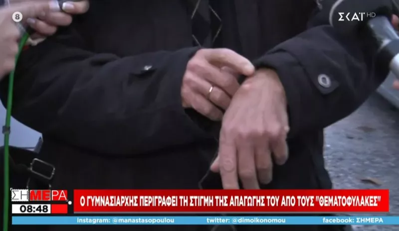 Έδειξε μάλιστα και τα σημάδια στα χέρια του από τις χειροπέδες που του πέρασε η ομάδα των αρνητών. Σύμφωνα με τον διευθυντή, όλα συνέβησαν μέσα σε δευτερόλεπτα.