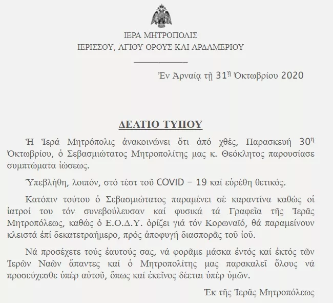 “Νά προσέχετε τούς ἑαυτούς σας, νά φορᾶμε μάσκα ἐντός καί ἐκτός τῶν Ἱερῶν Ναῶν ἅπαντες καί ὁ Μητροπολίτης μας παρακαλεῖ ὅλους νά προσεύχεσθε ὑπέρ αὐτοῦ, ὅπως καί ἐκεῖνος δέεται ὑπέρ ὑμῶν” αναφέρει η ανακοίνωση που εξέδωσε η μητρόπολη Ιερισσού.