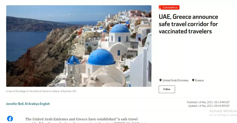 Στο πλαίσιο της συνεργασίας και του συντονισμού μεταξύ της Ελληνικής Δημοκρατίας και των Ηνωμένων Αραβικών Εμιράτων, στον δρόμο προς την ανάκαμψη από την πανδημία COVID-19, ανοίγει ασφαλής ταξιδιωτικός διάδρομος για τα πλήρως εμβολιασμένα άτομα, ενώ επιτεύχθηκε και συμφωνία αμοιβαίας αναγνώρισης πιστοποιητικών εμβολιασμού που θα εκδίδονται από τις υγειονομικές αρχές των δύο χωρών.