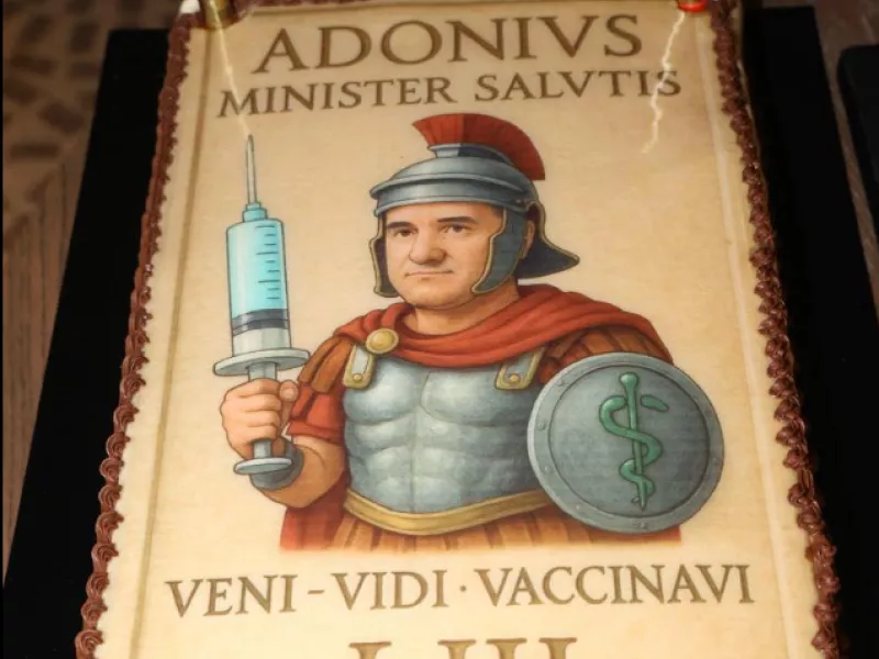 Στην τούρτα αναγράφεται το λατινικό μήνυμα: «Adonis Minister Salvtis – Veni Vidi Vaccinavi».