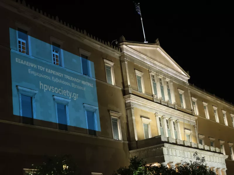 Με το μήνυμα «Εξάλειψη του Καρκίνου Τραχήλου Μήτρας - Ενημερώσου, Εμβολιάσου, Εξετάσου!» φωταγωγήθηκε το βράδυ της Τρίτης η πρόσοψη της Βουλής των Ελλήνων.