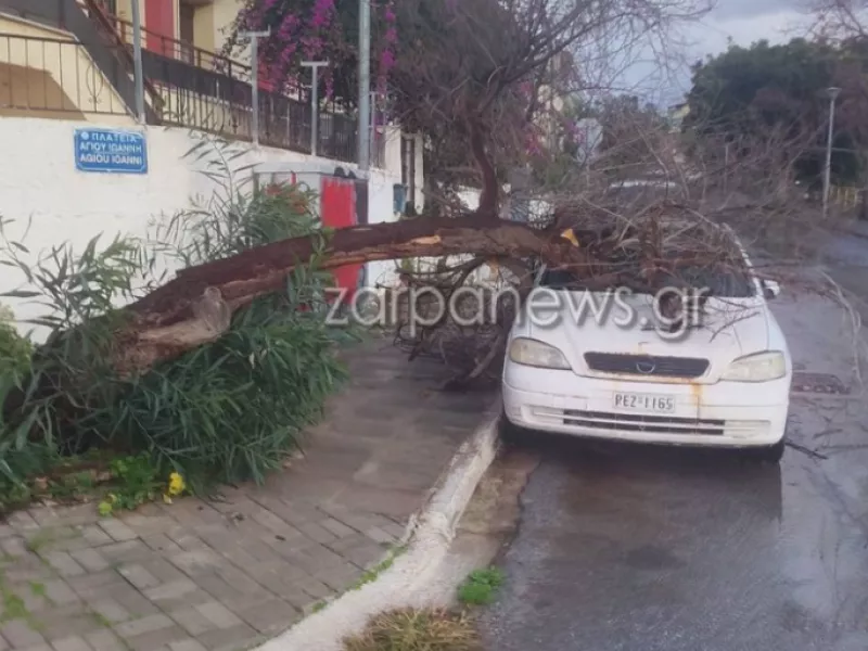 Την ίδια ώρα, στον Άγιο Ιωάννη, απέναντι από την εκκλησία, ο δυνατός αέρας έριξε δέντρο πάνω σε αυτοκίνητο.
