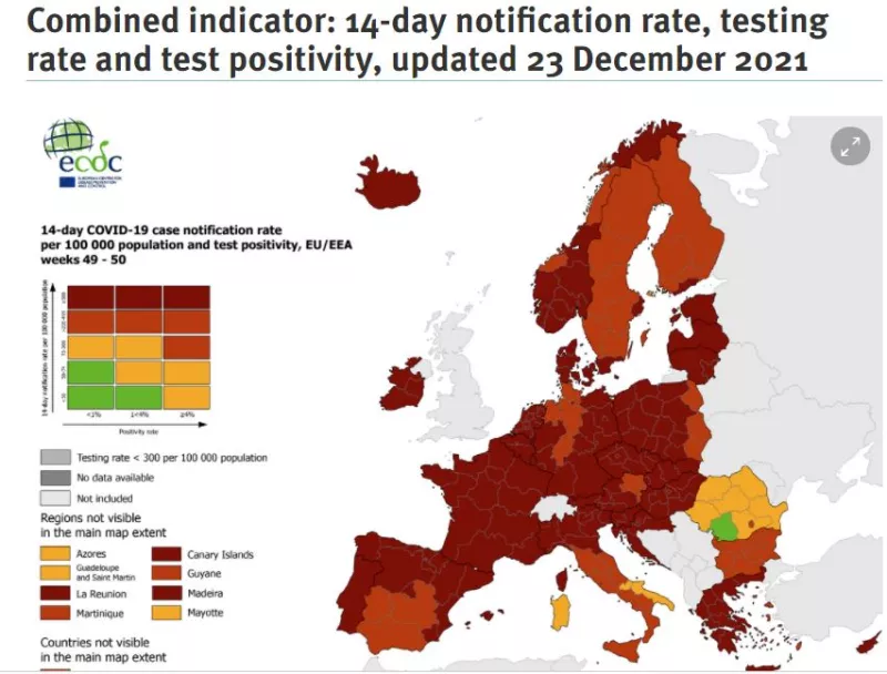 Στο «βαθύ κόκκινο» βρίσκεται για δεύτερη συνεχόμενη εβδομάδα η Ελλάδα, αλλά και οι περισσότερες χώρες σε όλη την Ευρώπη, σύμφωνα με τον ανανεωμένο χάρτη του ECDC.