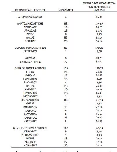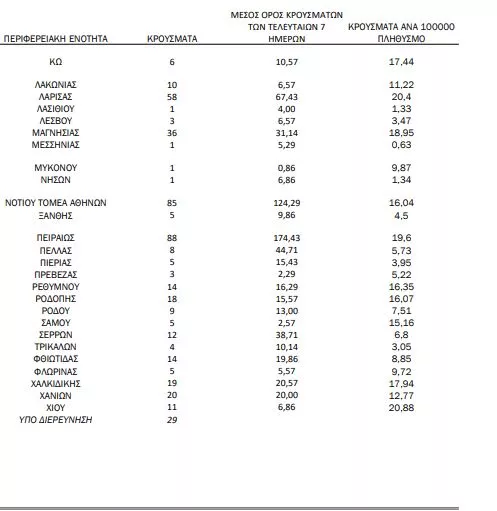 Την ίδια ώρα 186 κρούσματα καταγράφονται στην Θεσσαλονίκη και 57 και 58 σε Αχαία και Λάρισα αντίστοιχα.