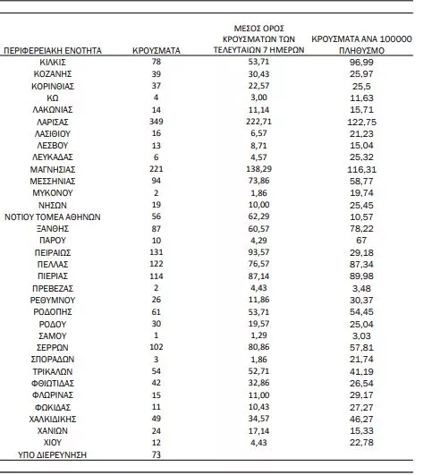 Στο «κόκκινο» παραμένουν η Θεσσαλονίκη με 591 νέες μολύνσεις και η Λάρισα με 349 κρούσματα, ενώ υψηλό αριθμό μολύνσεων καταγράφουν η Μαγνησία με 221, η Αχαΐα με 125, η Πέλλα με 122, η Πιερία με 114 και οι Σέρρες με 102.