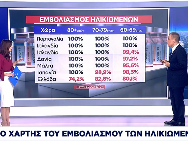 Όσον αφορά στην ηλικιακή ομάδα άνω των 80 ετών, στην Ελλάδα έχει εμβολιαστεί το 74,8%, τη στιγμή που στην Πορτογαλία, την Ιρλανδία, τη Δανία, τη Μάλτα, την Ισλανδία και την Ισπανία, έχει εμβολιαστεί το 100% σύμφωνα με τα στοιχεία του ECDC.