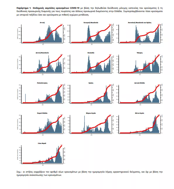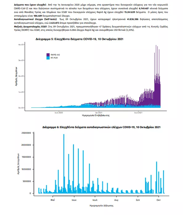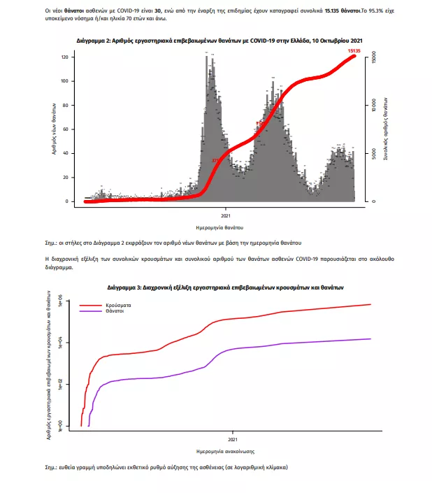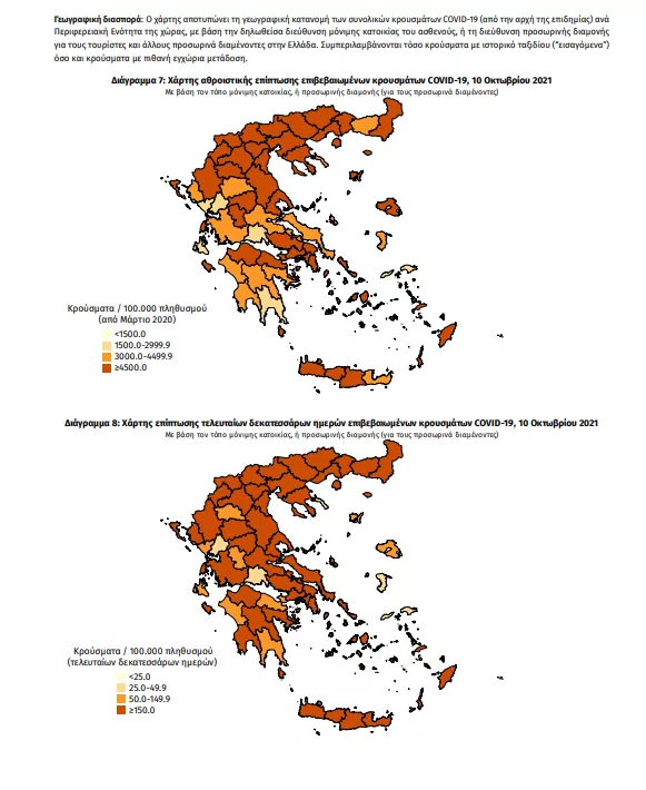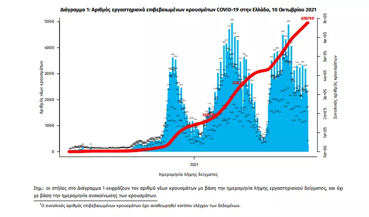 Τα στοιχεία που παρουσιάζονται αφορούν περιστατικά από την επιδημιολογική επιτήρηση της νόσου από το νέο κορωνοϊό (COVID19), με βάση τα δεδομένα που έχουν δηλωθεί στον ΕΟΔΥ και καταγραφεί μέχρι τις 10 Οκτωβρίου 2021 (ώρα 15:00). Τα νέα εργαστηριακά επιβεβαιωμένα κρούσματα της νόσου που καταγράφηκαν τις τελευταίες 24 ώρες είναι 1.358 , εκ των οποίων 10 εντοπίστηκαν κατόπιν ελέγχων στις πύλες εισόδου της χώρας. Ο συνολικός αριθμός των κρουσμάτων ανέρχεται σε 676.799 (ημερήσια μεταβολή +0.2%), εκ των οποίων 50.9% άνδρες. 1 Με βάση τα επιβεβαιωμένα κρούσματα των τελευταίων 7 ημερών, 113 θεωρούνται σχετιζόμενα με ταξίδι από το εξωτερικό και 3.565 είναι σχετιζόμενα με ήδη γνωστό κρούσμα. Ημερήσια εξέλιξη της πανδημίας: Η ημερήσια κατανομή των επιβεβαιωμένων κρουσμάτων είναι η ακόλουθη (η γραμμή παριστάνει την συνολική, αθροιστική κατανομή των κρουσμάτων).