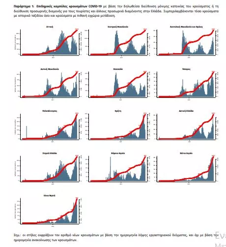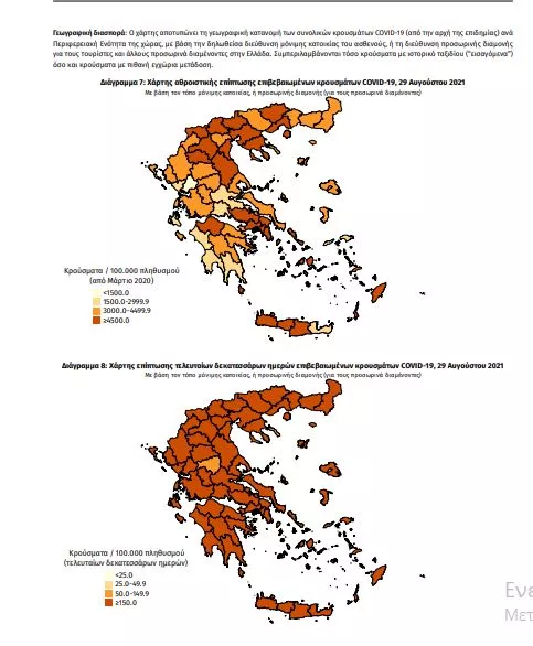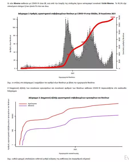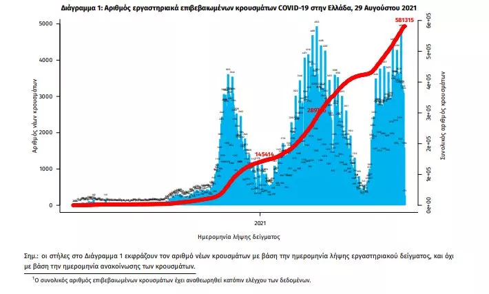 Τα στοιχεία που παρουσιάζονται αφορούν περιστατικά από την επιδημιολογική επιτήρηση της νόσου από το νέο κορωνοϊό (COVID19), με βάση τα δεδομένα που έχουν δηλωθεί στον ΕΟΔΥ και καταγραφεί μέχρι τις 29 Αυγούστου 2021 (ώρα 15:00). Τα νέα εργαστηριακά επιβεβαιωμένα κρούσματα της νόσου που καταγράφηκαν τις τελευταίες 24 ώρες είναι 1.582 , εκ των οποίων 15 εντοπίστηκαν κατόπιν ελέγχων στις πύλες εισόδου της χώρας. Ο συνολικός αριθμός των κρουσμάτων ανέρχεται σε 581.315 (ημερήσια μεταβολή +0.3%), εκ των οποίων 51.1% άνδρες. 1 Με βάση τα επιβεβαιωμένα κρούσματα των τελευταίων 7 ημερών, 218 θεωρούνται σχετιζόμενα με ταξίδι από το εξωτερικό και 1.643 είναι σχετιζόμενα με ήδη γνωστό κρούσμα. Ημερήσια εξέλιξη της πανδημίας: Η ημερήσια κατανομή των επιβεβαιωμένων κρουσμάτων είναι η ακόλουθη (η γραμμή παριστάνει την συνολική, αθροιστική κατανομή των κρουσμάτων).
