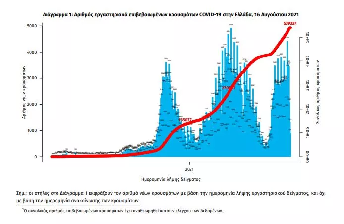 Σημ.: οι στήλες εκφράζουν τον αριθμό νέων κρουσμάτων με βάση την ημερομηνία λήψης εργαστηριακού δείγματος, και όχι με βάση την ημερομηνία ανακοίνωσης των κρουσμάτων
