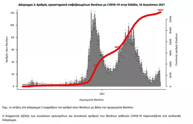 Οι νέοι θάνατοι ασθενών με COVID-19 είναι 13, ενώ από την έναρξη της επιδημίας έχουν καταγραφεί συνολικά 13.237 θάνατοι. 2 Το 95.2% είχε υποκείμενο νόσημα ή/και ηλικία 70 ετών και άνω.