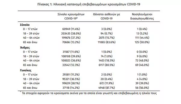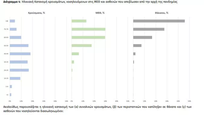 Ο αριθμός των ασθενών που νοσηλεύονται διασωληνωμένοι είναι 250 (60.0% άνδρες). Η διάμεση ηλικία τους είναι 64 έτη. To 85.2% έχει υποκείμενο νόσημα ή/και ηλικία 70 ετών και άνω. Από την αρχή της πανδημίας έχουν εξέλθει από τις ΜΕΘ 2.882 ασθενείς. Οι εισαγωγές3 νέων ασθενών Covid-19 στα νοσοκομεία της επικράτειας είναι 224 (ημερήσια μεταβολή +6.16%). Ο μέσος όρος εισαγωγών του επταημέρου είναι 233 ασθενείς.Η διάμεση ηλικία των κρουσμάτων είναι 40 έτη (εύρος 0.2 έως 106 έτη), ενώ η διάμεση ηλικία των θανόντων είναι 78 έτη (εύρος 0.2 έως 106 έτη).
