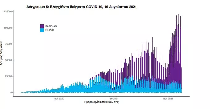 Δείγματα που έχουν ελεγχθεί: Από την 1η Ιανουαρίου 2020 μέχρι σήμερα, στα εργαστήρια που διενεργούν ελέγχους για τον νέο κορωνοϊό (SARS-CoV-2) και που δηλώνουν συστηματικά το σύνολο των δειγμάτων που ελέγχουν, έχουν συνολικά ελεγχθεί 5.996.157 κλινικά δείγματα ενώ από Μονάδες Υγείας και Κλιμάκια του ΕΟΔΥ που διενεργούν ελέγχους Rapid Ag έχουν ελεγχθεί 8.155.270 δείγματα. O μέσος όρος του επταημέρου είναι 86.557 δειγματοληπτικοί έλεγχοι.
