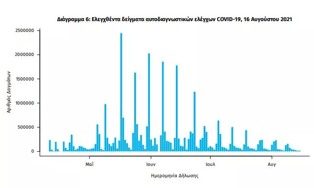 Αυτοδιαγνωστικοί έλεγχοι (Self-tests): Έως 15 Αυγούστου 2021, έχουν καταγραφεί ηλεκτρονικά 31.560.341 δηλώσεις αποτελέσματος αυτοδιαγνωστικού ελέγχου, ενώ 1.006.487 άτομα προσήλθαν για επανέλεγχο.