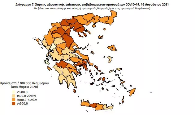Γεωγραφική διασπορά: Ο χάρτης αποτυπώνει τη γεωγραφική κατανομή των συνολικών κρουσμάτων COVID-19 (από την αρχή της επιδημίας) ανά Περιφερειακή Ενότητα της χώρας, με βάση την δηλωθείσα διεύθυνση μόνιμης κατοικίας του ασθενούς, ή τη διεύθυνση προσωρινής διαμονής για τους τουρίστες και άλλους προσωρινά διαμένοντες στην Ελλάδα. Συμπεριλαμβάνονται τόσο κρούσματα με ιστορικό ταξιδίου (“εισαγόμενα”) όσο και κρούσματα με πιθανή εγχώρια μετάδοση