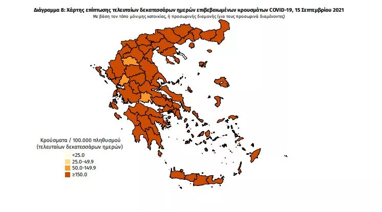 Γεωγραφική διασπορά: Ο χάρτης αποτυπώνει τη γεωγραφική κατανομή των συνολικών κρουσμάτων COVID-19 (από την αρχή της επιδημίας) ανά Περιφερειακή Ενότητα της χώρας, με βάση την δηλωθείσα διεύθυνση μόνιμης κατοικίας του ασθενούς, ή τη διεύθυνση προσωρινής διαμονής για τους τουρίστες και άλλους προσωρινά διαμένοντες στην Ελλάδα. Συμπεριλαμβάνονται τόσο κρούσματα με ιστορικό ταξιδίου (“εισαγόμενα”) όσο και κρούσματα με πιθανή εγχώρια μετάδοση.