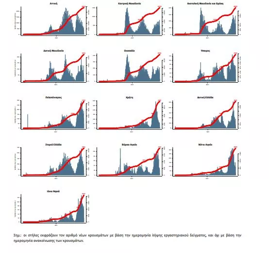 Παράρτημα 1: Επιδημικές καμπύλες κρουσμάτων COVID-19 με βάση την δηλωθείσα διεύθυνση μόνιμης κατοικίας του κρούσματος ή τη διεύθυνση προσωρινής διαμονής για τους τουρίστες και άλλους προσωρινά διαμένοντες στην Ελλάδα. Συμπεριλαμβάνονται τόσο κρούσματα με ιστορικό ταξιδίου όσο και κρούσματα με πιθανή εγχώρια μετάδοση.