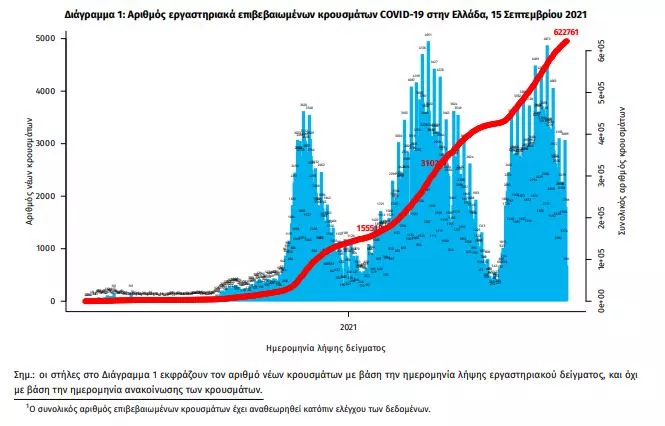 Τα νέα εργαστηριακά επιβεβαιωμένα κρούσματα της νόσου που καταγράφηκαν τις τελευταίες 24 ώρες είναι 2.422, εκ των οποίων 6 εντοπίστηκαν κατόπιν ελέγχων στις πύλες εισόδου της χώρας. Ο συνολικός αριθμός των κρουσμάτων ανέρχεται σε 622.761 (ημερήσια μεταβολή +0.4%), εκ των οποίων 51.0% άνδρες. 1 Με βάση τα επιβεβαιωμένα κρούσματα των τελευταίων 7 ημερών, 135 θεωρούνται σχετιζόμενα με ταξίδι από το εξωτερικό και 2.607 είναι σχετιζόμενα με ήδη γνωστό κρούσμα. To 𝑅𝑡 για την επικράτεια βάσει των κρουσμάτων εκτιμάται σε 0.94 (95% ΔΕ: 0.83 - 1.02)