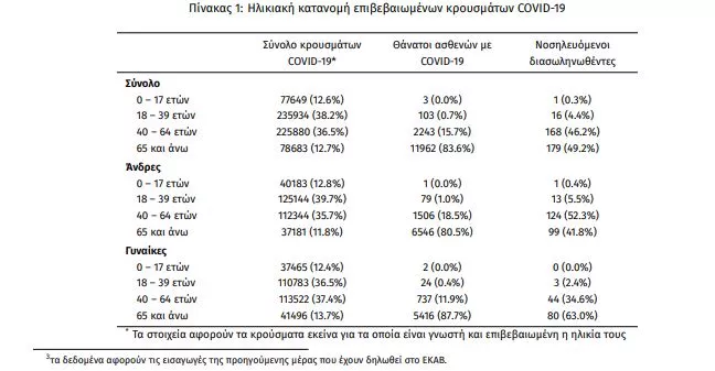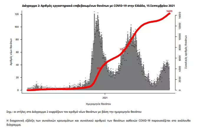Οι νέοι θάνατοι ασθενών με COVID-19 είναι 37, ενώ από την έναρξη της επιδημίας έχουν καταγραφεί συνολικά 14.311 θάνατοι. 2 Το 95.4% είχε υποκείμενο νόσημα ή/και ηλικία 70 ετών και άνω