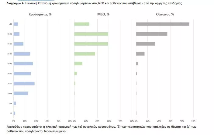 Ο αριθμός των ασθενών που νοσηλεύονται διασωληνωμένοι είναι 364 (64.8% άνδρες). Η διάμεση ηλικία τους είναι 64 έτη. To 81.0% έχει υποκείμενο νόσημα ή/και ηλικία 70 ετών και άνω. Μεταξύ των ασθενών που νοσηλεύονται διασωληνωμένοι, 330 (90.66%) είναι ανεμβολίαστοι ή μερικώς εμβολιασμένοι και 34 (9.34%) είναι πλήρως εμβολιασμένοι. Από την αρχή της πανδημίας έχουν εξέλθει από τις ΜΕΘ 3.069 ασθενείς. Οι εισαγωγές3 νέων ασθενών Covid-19 στα νοσοκομεία της επικράτειας είναι 224 (ημερήσια μεταβολή +9.27%). Ο μέσος όρος εισαγωγών του επταημέρου είναι 208 ασθενείς.Η διάμεση ηλικία των κρουσμάτων είναι 39 έτη (εύρος 0.2 έως 106 έτη), ενώ η διάμεση ηλικία των θανόντων είναι 78 έτη (εύρος 0.2 έως 106 έτη).