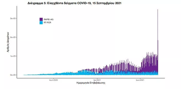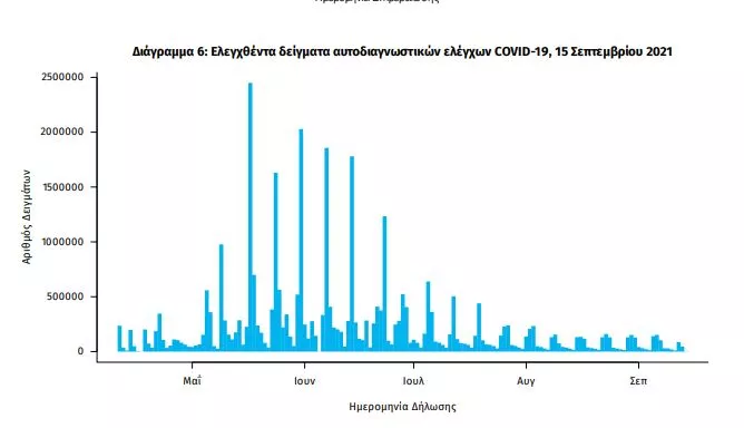 Αυτοδιαγνωστικοί έλεγχοι (Self-tests): Έως 14 Σεπτεμβρίου 2021, έχουν καταγραφεί ηλεκτρονικά 33.694.851 δηλώσεις αποτελέσματος αυτοδιαγνωστικού ελέγχου. Από τα 1.405.286 άτομα που προσήλθαν για επανέλεγχο, έχουν καταγραφεί 97.796 θετικά αποτελέσματα.