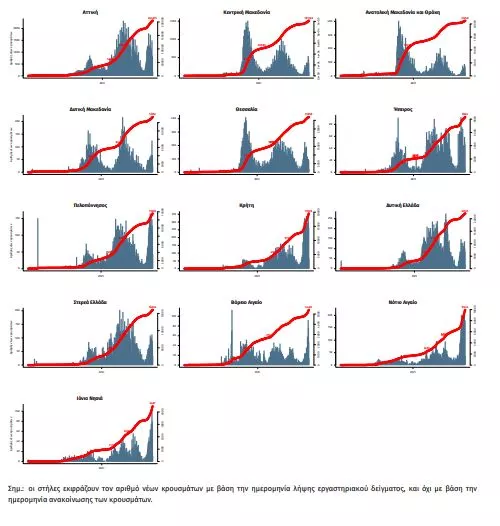 Παράρτημα 1: Επιδημικές καμπύλες κρουσμάτων COVID-19 με βάση την δηλωθείσα διεύθυνση μόνιμης κατοικίας του κρούσματος ή τη διεύθυνση προσωρινής διαμονής για τους τουρίστες και άλλους προσωρινά διαμένοντες στην Ελλάδα. Συμπεριλαμβάνονται τόσο κρούσματα με ιστορικό ταξιδίου όσο και κρούσματα με πιθανή εγχώρια μετάδοση.