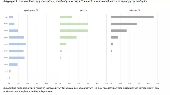 Ο αριθμός των ασθενών που νοσηλεύονται διασωληνωμένοι είναι 157 (61.8% άνδρες). Η διάμεση ηλικία τους είναι 65 έτη. To 82.8% έχει υποκείμενο νόσημα ή/και ηλικία 70 ετών και άνω. Από την αρχή της πανδημίας έχουν εξέλθει από τις ΜΕΘ 2.802 ασθενείς. Οι εισαγωγές2 νέων ασθενών Covid-19 στα νοσοκομεία της επικράτειας είναι 173 (ημερήσια μεταβολή -11.73%). Ο μέσος όρος εισαγωγών του επταημέρου είναι 167 ασθενείς.Η διάμεση ηλικία των κρουσμάτων είναι 41 έτη (εύρος 0.2 έως 106 έτη), ενώ η διάμεση ηλικία των θανόντων είναι 78 έτη (εύρος 0.2 έως 106 έτη).