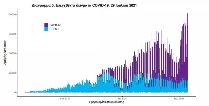Mαζικές Δειγματοληψίες ΕΟΔΥ: Στις 28 Ιουλίου 2021, πραγματοποιήθηκαν 137 δράσεις δειγματοληπτικών ελέγχων από τις Κινητές Ομάδες Υγείας (ΚΟΜΥ) του ΕΟΔΥ, στις οποίες διενεργήθηκαν 30.904 έλεγχοι Rapid Ag και ανευρέθηκαν 503 θετικά (1,63%).
