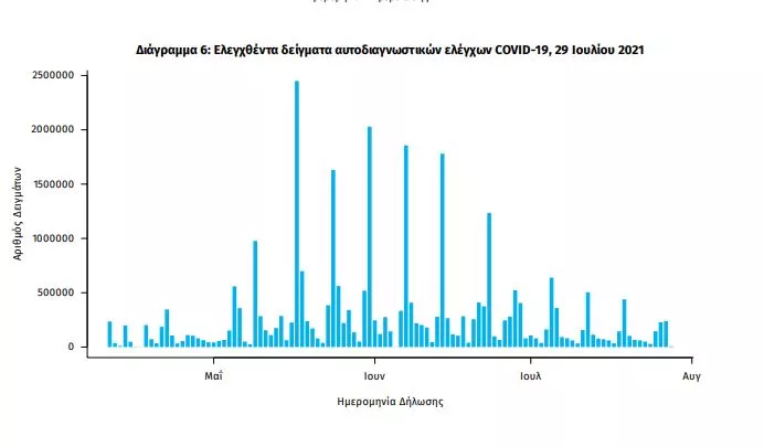 Αυτοδιαγνωστικοί έλεγχοι (Self-tests): Έως 28 Ιουλίου 2021, έχουν καταγραφεί ηλεκτρονικά 30.178.826 δηλώσεις αποτελέσματος αυτοδιαγνωστικού ελέγχου, ενώ 773.032 άτομα προσήλθαν για επανέλεγχο.