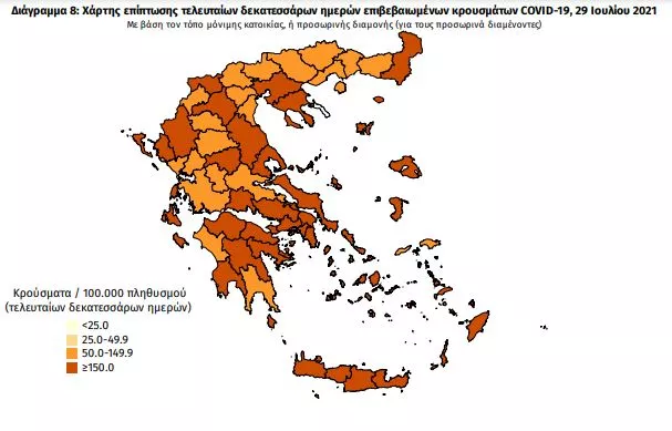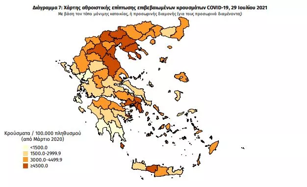 Γεωγραφική διασπορά: Ο χάρτης αποτυπώνει τη γεωγραφική κατανομή των συνολικών κρουσμάτων COVID-19 (από την αρχή της επιδημίας) ανά Περιφερειακή Ενότητα της χώρας, με βάση την δηλωθείσα διεύθυνση μόνιμης κατοικίας του ασθενούς, ή τη διεύθυνση προσωρινής διαμονής για τους τουρίστες και άλλους προσωρινά διαμένοντες στην Ελλάδα. Συμπεριλαμβάνονται τόσο κρούσματα με ιστορικό ταξιδίου (“εισαγόμενα”) όσο και κρούσματα με πιθανή εγχώρια μετάδοση.