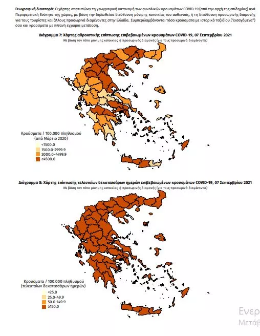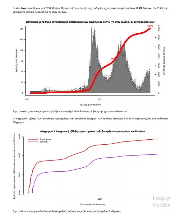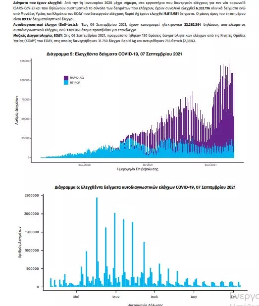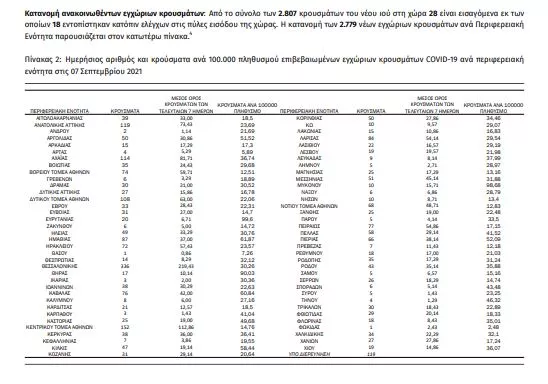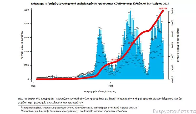 Τα στοιχεία που παρουσιάζονται αφορούν περιστατικά από την επιδημιολογική επιτήρηση της νόσου από το νέο κορωνοϊό (COVID19), με βάση τα δεδομένα που έχουν δηλωθεί στον ΕΟΔΥ και καταγραφεί μέχρι τις 07 Σεπτεμβρίου 2021 (ώρα 15:00). Τα νέα εργαστηριακά επιβεβαιωμένα κρούσματα της νόσου που καταγράφηκαν τις τελευταίες 24 ώρες είναι 2.807, εκ των οποίων 18 εντοπίστηκαν κατόπιν ελέγχων στις πύλες εισόδου της χώρας. Ο συνολικός αριθμός των κρουσμάτων ανέρχεται σε 605.158 (ημερήσια μεταβολή +0.6%), εκ των οποίων 51.0% άνδρες. 1 2 Με βάση τα επιβεβαιωμένα κρούσματα των τελευταίων 7 ημερών, 144 θεωρούνται σχετιζόμενα με ταξίδι από το εξωτερικό και 1.764 είναι σχετιζόμενα με ήδη γνωστό κρούσμα. Ημερήσια εξέλιξη της πανδημίας: Η ημερήσια κατανομή των επιβεβαιωμένων κρουσμάτων είναι η ακόλουθη (η γραμμή παριστάνει την συνολική, αθροιστική κατανομή των κρουσμάτων).