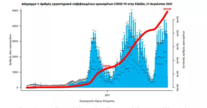 τα νέα εργαστηριακά επιβεβαιωμένα κρούσματα της νόσου που καταγράφηκαν τις τελευταίες 24 ώρες είναι 3.191 , εκ των οποίων 19 εντοπίστηκαν κατόπιν ελέγχων στις πύλες εισόδου της χώρας. Ο συνολικός αριθμός των κρουσμάτων ανέρχεται σε 557.239 (ημερήσια μεταβολή +0.6%), εκ των οποίων 51.1% άνδρες.