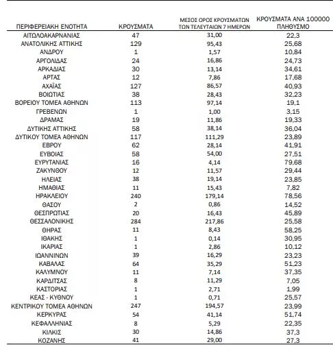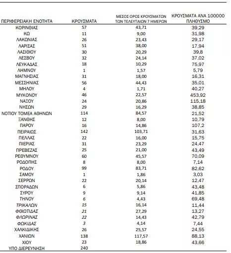 Με βάση τα επιβεβαιωμένα κρούσματα των τελευταίων 7 ημερών, 128 θεωρούνται σχετιζόμενα με ταξίδι από το εξωτερικό και 2.564 είναι σχετιζόμενα με ήδη γνωστό κρούσμα.
