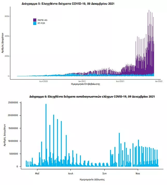 Δείγματα που έχουν ελεγχθεί: Από την 1η Ιανουαρίου 2020 μέχρι σήμερα, στα εργαστήρια που διενεργούν ελέγχους για τον νέο κορωνοϊό (SARS-CoV-2) και που δηλώνουν συστηματικά το σύνολο των δειγμάτων που ελέγχουν, έχουν συνολικά ελεγχθεί 7.677.364 κλινικά δείγματα ενώ από Μονάδες Υγείας και Κλιμάκια του ΕΟΔΥ που διενεργούν ελέγχους Rapid Ag έχουν ελεγχθεί 31.879.713 δείγματα. O μέσος όρος του επταημέρου είναι 358.224 δειγματοληπτικοί έλεγχοι.