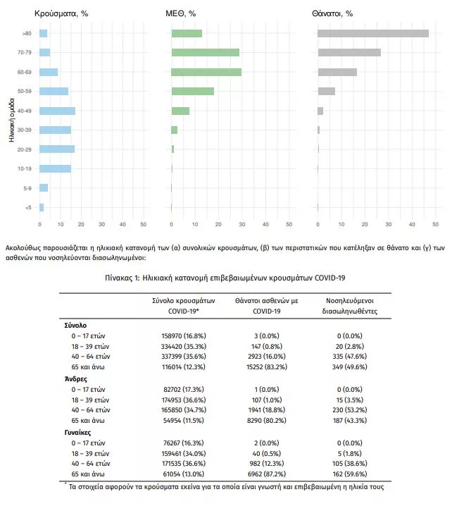 Ο αριθμός των ασθενών που νοσηλεύονται διασωληνωμένοι είναι 704 (61.2% άνδρες). Η διάμεση ηλικία τους είναι 64 έτη. To 81.1% έχει υποκείμενο νόσημα ή/και ηλικία 70 ετών και άνω. Μεταξύ των ασθενών που νοσηλεύονται διασωληνωμένοι, 558 (79.26%) είναι ανεμβολίαστοι ή μερικώς εμβολιασμένοι και 146 (20.74%) είναι πλήρως εμβολιασμένοι. Από την αρχή της πανδημίας έχουν εξέλθει από τις ΜΕΘ 3.533 ασθενείς. Οι εισαγωγές3 νέων ασθενών Covid-19 στα νοσοκομεία της επικράτειας είναι 453 (ημερήσια μεταβολή -10.65%). Ο μέσος όρος εισαγωγών του επταημέρου είναι 458 ασθενείς.Η διάμεση ηλικία των κρουσμάτων είναι 38 έτη (εύρος 0.2 έως 106 έτη), ενώ η διάμεση ηλικία των θανόντων είναι 78 έτη (εύρος 0.2 έως 106 έτη).