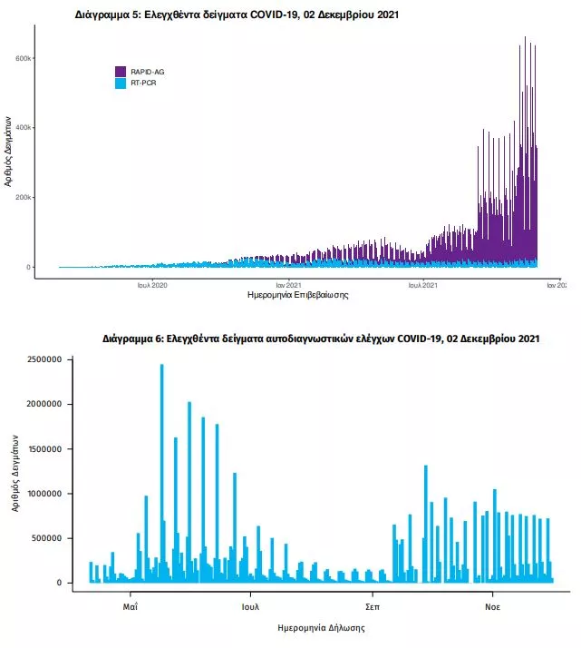 Δείγματα που έχουν ελεγχθεί: Από την 1η Ιανουαρίου 2020 μέχρι σήμερα, στα εργαστήρια που διενεργούν ελέγχους για τον νέο κορωνοϊό (SARS-CoV-2) και που δηλώνουν συστηματικά το σύνολο των δειγμάτων που ελέγχουν, έχουν συνολικά ελεγχθεί 7.530.058 κλινικά δείγματα ενώ από Μονάδες Υγείας και Κλιμάκια του ΕΟΔΥ που διενεργούν ελέγχους Rapid Ag έχουν ελεγχθεί 29.519.451 δείγματα. O μέσος όρος του επταημέρου είναι 367.964 δειγματοληπτικοί έλεγχοι.