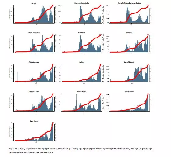 Παράρτημα 1: Επιδημικές καμπύλες κρουσμάτων COVID-19 με βάση την δηλωθείσα διεύθυνση μόνιμης κατοικίας του κρούσματος ή τη διεύθυνση προσωρινής διαμονής για τους τουρίστες και άλλους προσωρινά διαμένοντες στην Ελλάδα. Συμπεριλαμβάνονται τόσο κρούσματα με ιστορικό ταξιδίου όσο και κρούσματα με πιθανή εγχώρια μετάδοση.