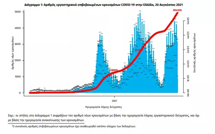 Τα νέα εργαστηριακά επιβεβαιωμένα κρούσματα της νόσου που καταγράφηκαν τις τελευταίες 24 ώρες είναι 3.625 , εκ των οποίων 16 εντοπίστηκαν κατόπιν ελέγχων στις πύλες εισόδου της χώρας. Ο συνολικός αριθμός των κρουσμάτων ανέρχεται σε 554.055 (ημερήσια μεταβολή +0.7%), εκ των οποίων 51.1% άνδρες. 1 Με βάση τα επιβεβαιωμένα κρούσματα των τελευταίων 7 ημερών, 129 θεωρούνται σχετιζόμενα με ταξίδι από το εξωτερικό και 1.578 είναι σχετιζόμενα με ήδη γνωστό κρούσμα.