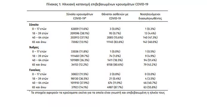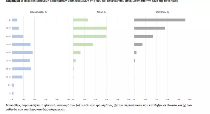 Ο αριθμός των ασθενών που νοσηλεύονται διασωληνωμένοι είναι 296 (61.1% άνδρες). Η διάμεση ηλικία τους είναι 64 έτη. To 83.4% έχει υποκείμενο νόσημα ή/και ηλικία 70 ετών και άνω. Από την αρχή της πανδημίας έχουν εξέλθει από τις ΜΕΘ 2.904 ασθενείς. Οι εισαγωγές2 νέων ασθενών Covid-19 στα νοσοκομεία της επικράτειας είναι 267 (ημερήσια μεταβολή -3.26%). Ο μέσος όρος εισαγωγών του επταημέρου είναι 253 ασθενείς.Η διάμεση ηλικία των κρουσμάτων είναι 40 έτη (εύρος 0.2 έως 106 έτη), ενώ η διάμεση ηλικία των θανόντων είναι 78 έτη (εύρος 0.2 έως 106 έτη).