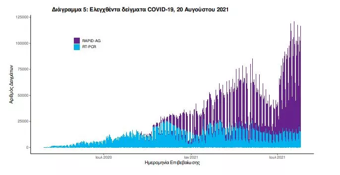 Δείγματα που έχουν ελεγχθεί: Από την 1η Ιανουαρίου 2020 μέχρι σήμερα, στα εργαστήρια που διενεργούν ελέγχους για τον νέο κορωνοϊό (SARS-CoV-2) και που δηλώνουν συστηματικά το σύνολο των δειγμάτων που ελέγχουν, έχουν συνολικά ελεγχθεί 6.062.781 κλινικά δείγματα ενώ από Μονάδες Υγείας και Κλιμάκια του ΕΟΔΥ που διενεργούν ελέγχους Rapid Ag έχουν ελεγχθεί 8.505.830 δείγματα. O μέσος όρος του επταημέρου είναι 87.627 δειγματοληπτικοί έλεγχοι.