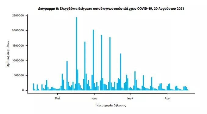 Αυτοδιαγνωστικοί έλεγχοι (Self-tests): Έως 19 Αυγούστου 2021, έχουν καταγραφεί ηλεκτρονικά 31.969.789 δηλώσεις αποτελέσματος αυτοδιαγνωστικού ελέγχου, ενώ 1.062.707 άτομα προσήλθαν για επανέλεγχο.