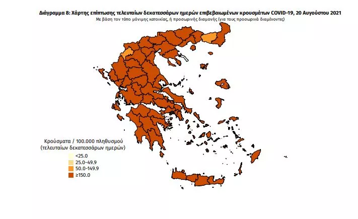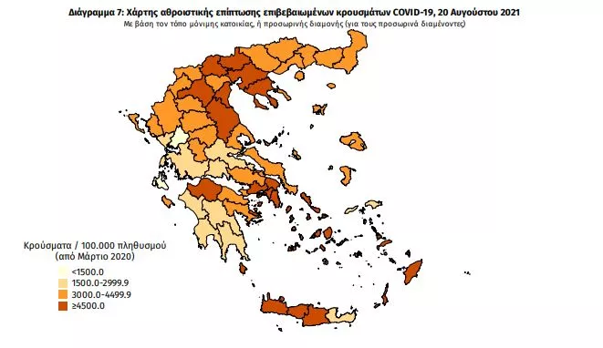 Γεωγραφική διασπορά: Ο χάρτης αποτυπώνει τη γεωγραφική κατανομή των συνολικών κρουσμάτων COVID-19 (από την αρχή της επιδημίας) ανά Περιφερειακή Ενότητα της χώρας, με βάση την δηλωθείσα διεύθυνση μόνιμης κατοικίας του ασθενούς, ή τη διεύθυνση προσωρινής διαμονής για τους τουρίστες και άλλους προσωρινά διαμένοντες στην Ελλάδα. Συμπεριλαμβάνονται τόσο κρούσματα με ιστορικό ταξιδίου (“εισαγόμενα”) όσο και κρούσματα με πιθανή εγχώρια μετάδοση
