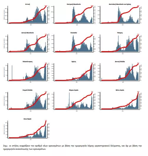 Παράρτημα 1: Επιδημικές καμπύλες κρουσμάτων COVID-19 με βάση την δηλωθείσα διεύθυνση μόνιμης κατοικίας του κρούσματος ή τη διεύθυνση προσωρινής διαμονής για τους τουρίστες και άλλους προσωρινά διαμένοντες στην Ελλάδα. Συμπεριλαμβάνονται τόσο κρούσματα με ιστορικό ταξιδίου όσο και κρούσματα με πιθανή εγχώρια μετάδοση
