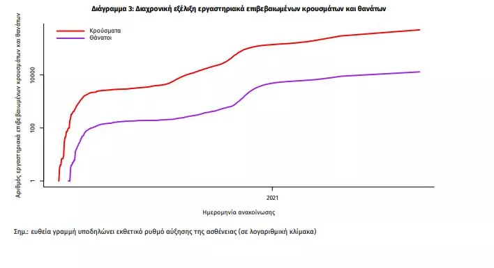 Η διαχρονική εξέλιξη των συνολικών κρουσμάτων και συνολικού αριθμού των θανάτων ασθενών COVID-19 παρουσιάζεται στο ακόλουθο διάγραμμα.