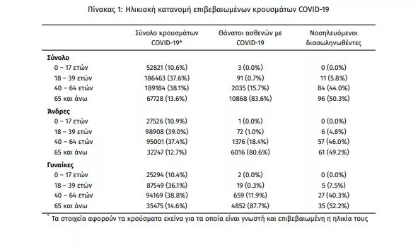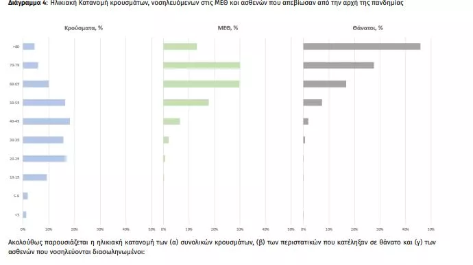 Ο αριθμός των ασθενών που νοσηλεύονται διασωληνωμένοι είναι 191 (64.9% άνδρες). Η διάμεση ηλικία τους είναι 65 έτη. To 82.2% έχει υποκείμενο νόσημα ή/και ηλικία 70 ετών και άνω. Από την αρχή της πανδημίας έχουν εξέλθει από τις ΜΕΘ 2.815 ασθενείς. Οι εισαγωγές3 νέων ασθενών Covid-19 στα νοσοκομεία της επικράτειας είναι 142 (ημερήσια μεταβολή -14.97%). Ο μέσος όρος εισαγωγών του επταημέρου είναι 171 ασθενείς.Η διάμεση ηλικία των κρουσμάτων είναι 41 έτη (εύρος 0.2 έως 106 έτη), ενώ η διάμεση ηλικία των θανόντων είναι 78 έτη (εύρος 0.2 έως 106 έτη).