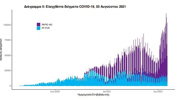 Δείγματα που έχουν ελεγχθεί: Από την 1η Ιανουαρίου 2020 μέχρι σήμερα, στα εργαστήρια που διενεργούν ελέγχους για τον νέο κορωνοϊό (SARS-CoV-2) και που δηλώνουν συστηματικά το σύνολο των δειγμάτων που ελέγχουν, έχουν συνολικά ελεγχθεί 5.841.581 κλινικά δείγματα ενώ από Μονάδες Υγείας και Κλιμάκια του ΕΟΔΥ που διενεργούν ελέγχους Rapid Ag έχουν ελεγχθεί 7.183.663 δείγματα. O μέσος όρος του επταημέρου είναι 91.445 δειγματοληπτικοί έλεγχοι.